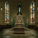 But Gregori’s contributions did not stop there. Besides his magnificent painting of the nave, the transept, the ceilings, and the apse in the Basilica, Gregori’s Father Edward Sorin Performing a Wedding for the Potawatomi is a must-see, and his Saint Bernadette and the Lady of Lourdes appears to have been the model used in the design of our Grotto.