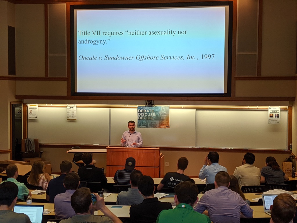 Anderson argued that it cannot extend in this way. Both in his talk and in his recently-filed amicus brief for employers, he emphasizes that no person is excluded from the protection of Title VII. Congress did not include sexual orientation or gender identity, and has not chosen to do so since. In each of the past 50 years, Congress has introduced a ban on sexual orientaton discrimination and “rejected it.” In the past 25 years, Congress has also introduced gender identity into the Civil Rights Act, and these proposals too have failed. The city of South Bend, Anderson emphasized, has an ordinance prohibiting discrimination on the basis of sex, sexual orientation and gender identity, but it didn’t always.