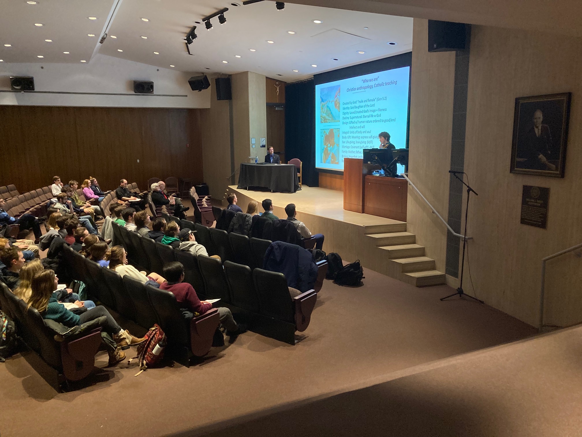 Photo credit: Hasson and Bursch speak in Carey Auditorium, Hesburgh Library on February 17th, 2022; Photo by Students for Child-Oriented Policy