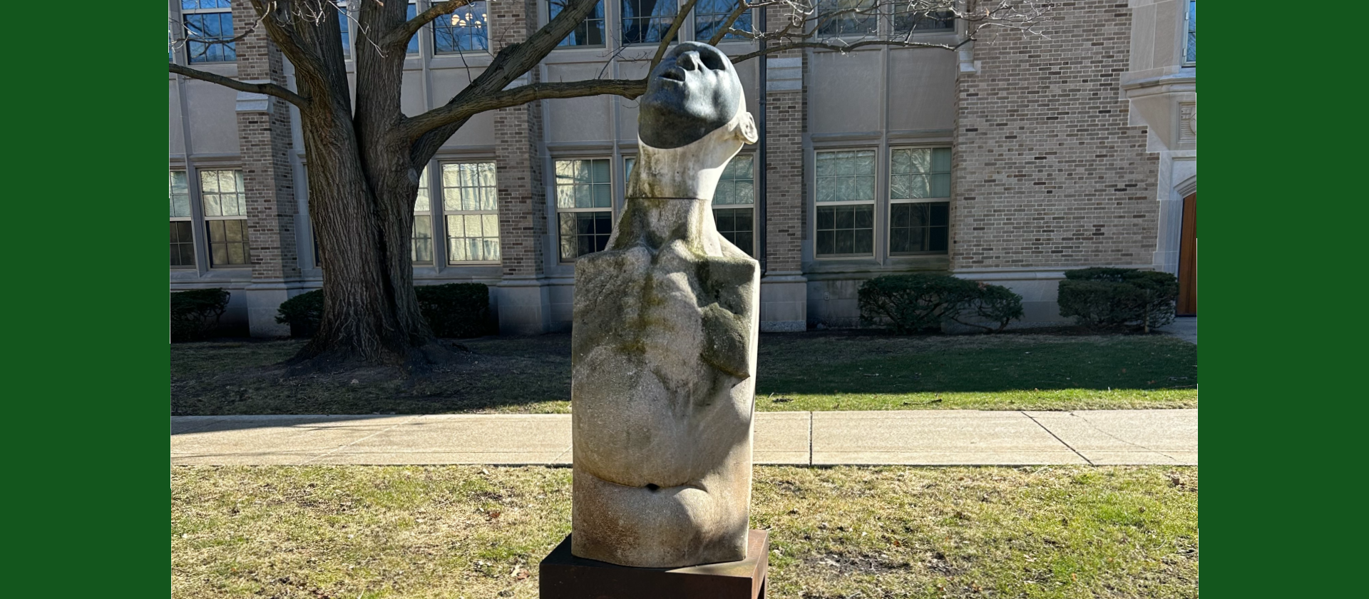 At the edge of South Quad, perched on a small, four-legged pedestal, stands what is called by some students the “screaming torso.” The statue’s black face, twisted in a sort of howl, contrasts with the narrow, white chest and belly beneath it.