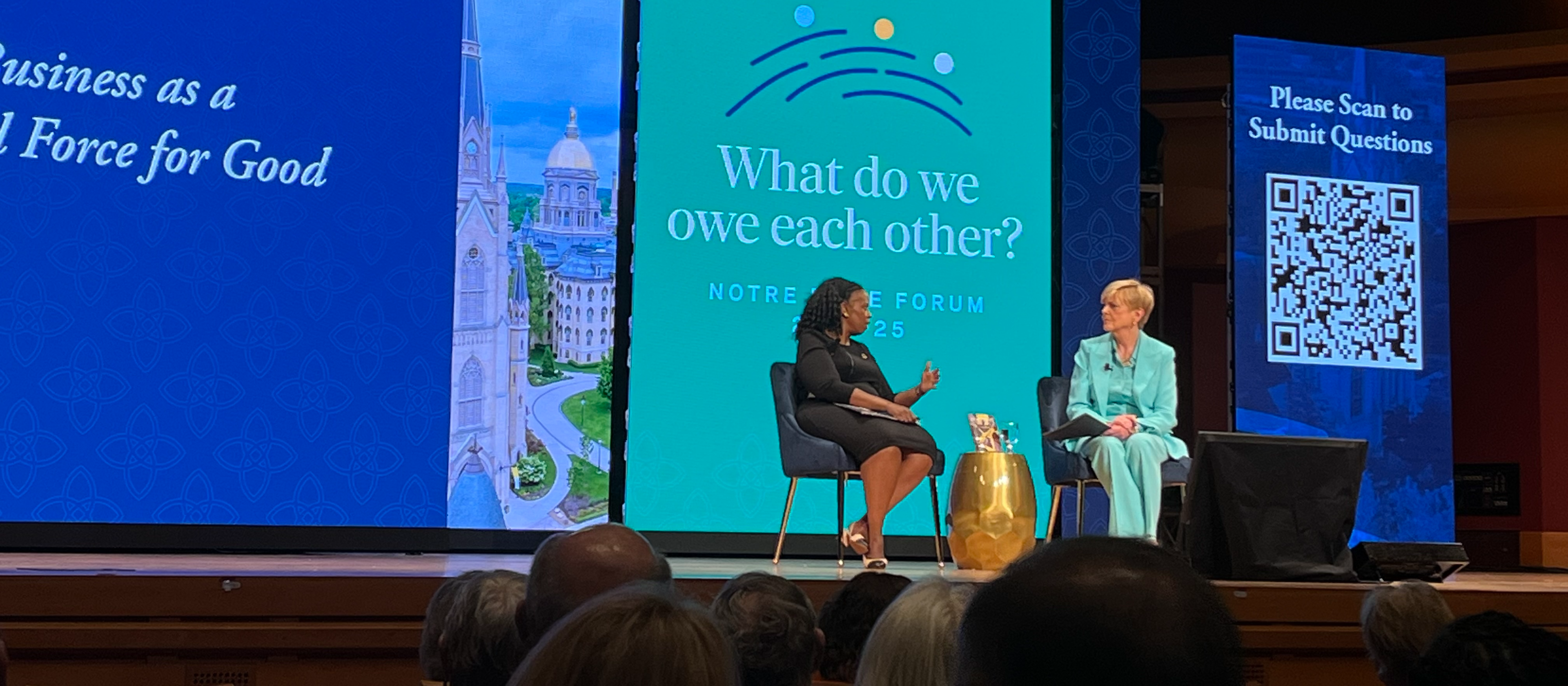 The talk was well-attended, with notable attendees including former Notre Dame presidents Father John Jenkins, C.S.C. and Father Edward Malloy, C.S.C., as well as Dean of the Law School Marcus Cole and other university officials.