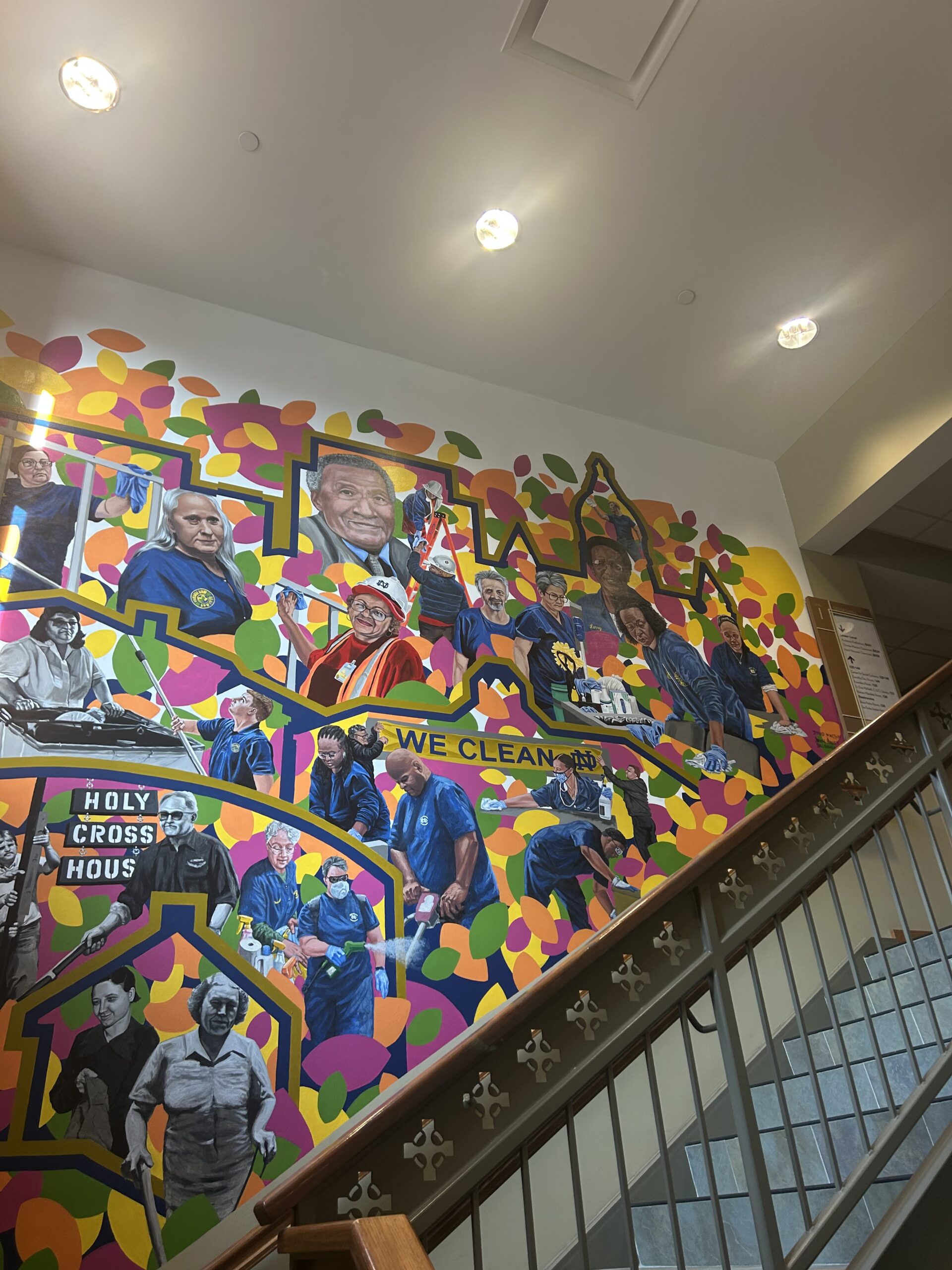 The mural spans across the wall along the main floor stairwell of Geddes. The work depicts 33 images of Notre Dame service employees in the mixed mediums of either photography or painting against a leaf-like patterned background painted in the colors of the ISC logo.